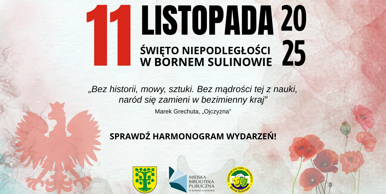 Serdecznie zapraszamy do udziału w Obchodach Święta Niepodległości, które odbędą się już 11 listopada 2025 roku w Bornem Sulinowie. W tym szczególnym dniu będziemy wspólnie celebrować odzyskanie przez Polskę niepodległości, oddając hołd bohaterom, którzy walczyli o wolność naszej Ojczyzny.
