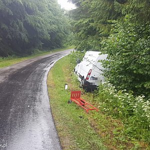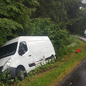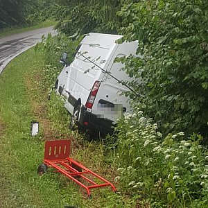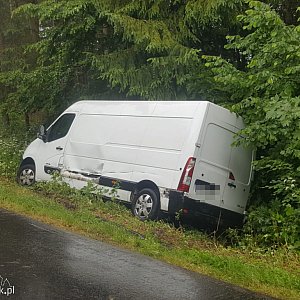 Samochody „otarły” się na łuku wąskiej drogi. Samochód dostawczy po kolizji zjechał na pobocze i zatrzymał się w rowie. Nikomu nic się nie stało.