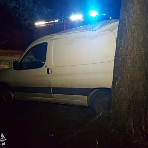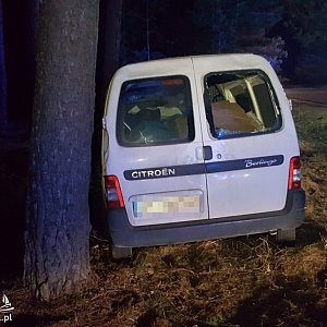 Na łuku drogi pojazd wpadł w poślizg i zjechał na pobocze uderzając w drzewo. Wcześniej samochód obrócił się o 180 stopni.