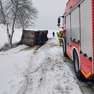 Kolejny niebezpieczny poranek na drogach powiatu szczecineckiego. W piątek nad ranem na drodze krajowej nr 11, w pobliżu zjazdu do Drężno, doszło do kilku zdarzeń drogowych. Najpoważniejsze z nich dotyczyło samochodu ciężarowego, który wpadł w poślizg na oblodzonej jezdni, zjechał do rowu i przewrócił się na bok.
