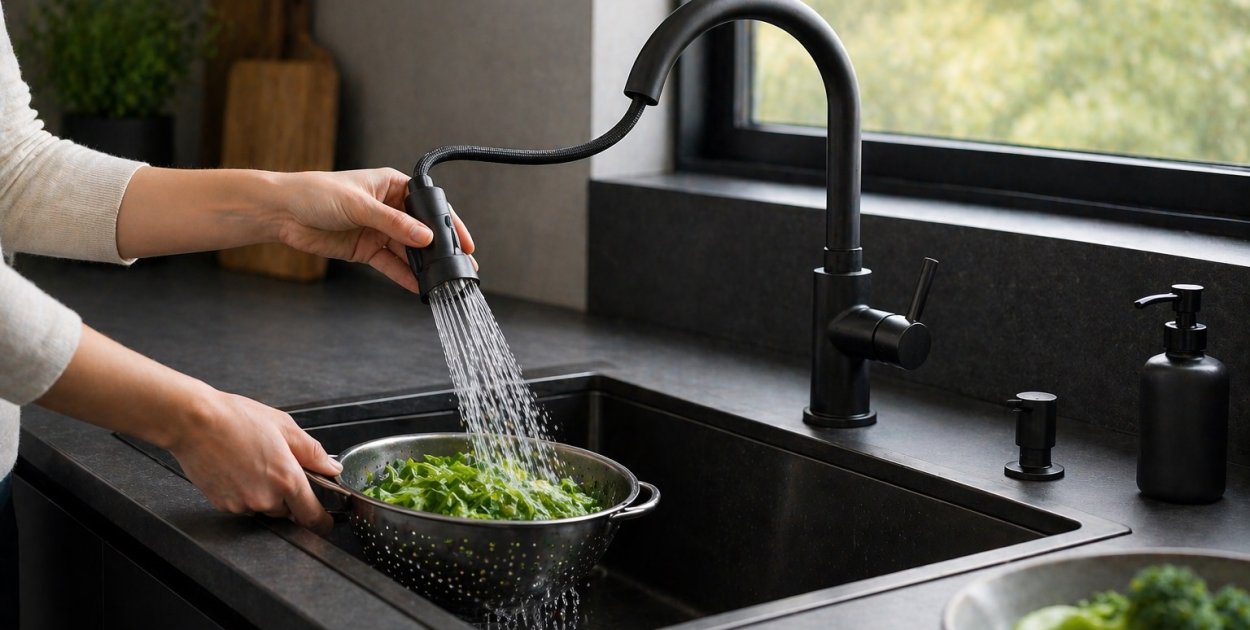 Wyciągana wylewka rozwiązuje ten problem. Zamiast przesuwać ciężkie naczynie, przesuwasz strumień wody. To znacznie wygodniejsze i bardziej ergonomiczne.