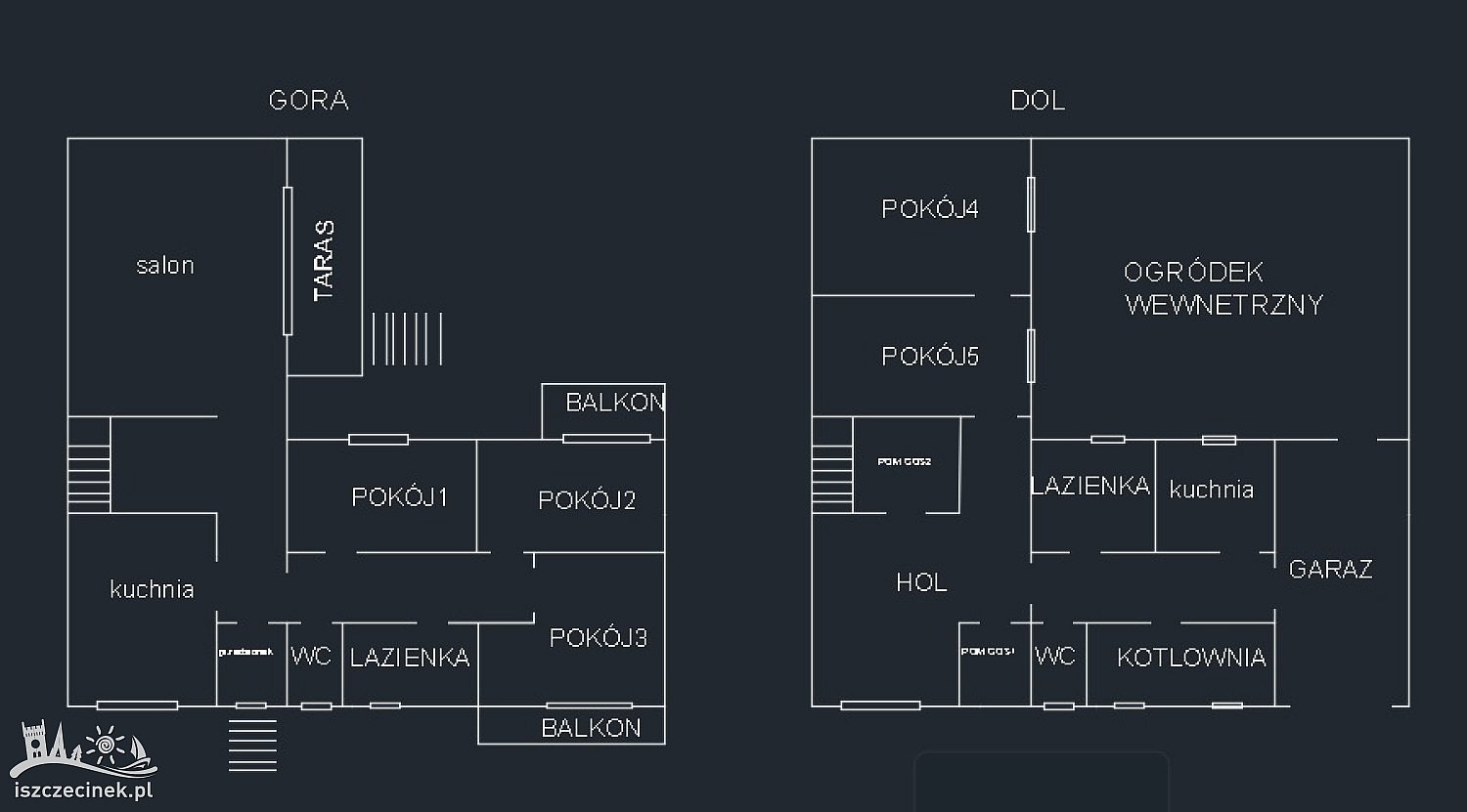 1. dól- pokój 2x, kuchnia , łazienka, toaleta, pomieszczenia gospodarcze 2x, kotłownia, garaż