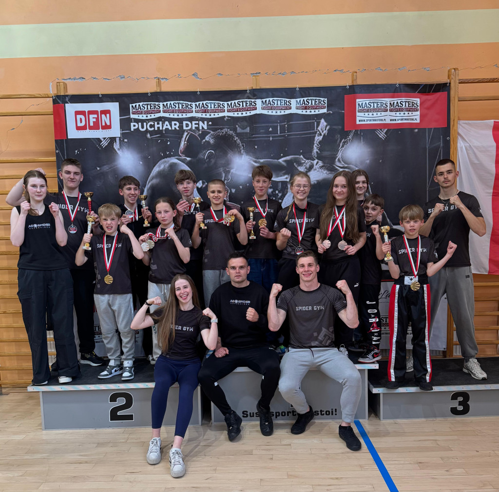 Zawodnicy Akademii Spider Szczecinek podczas dekoracji medalowej na Pucharze Polski w Suszu, 24 maja 2025.