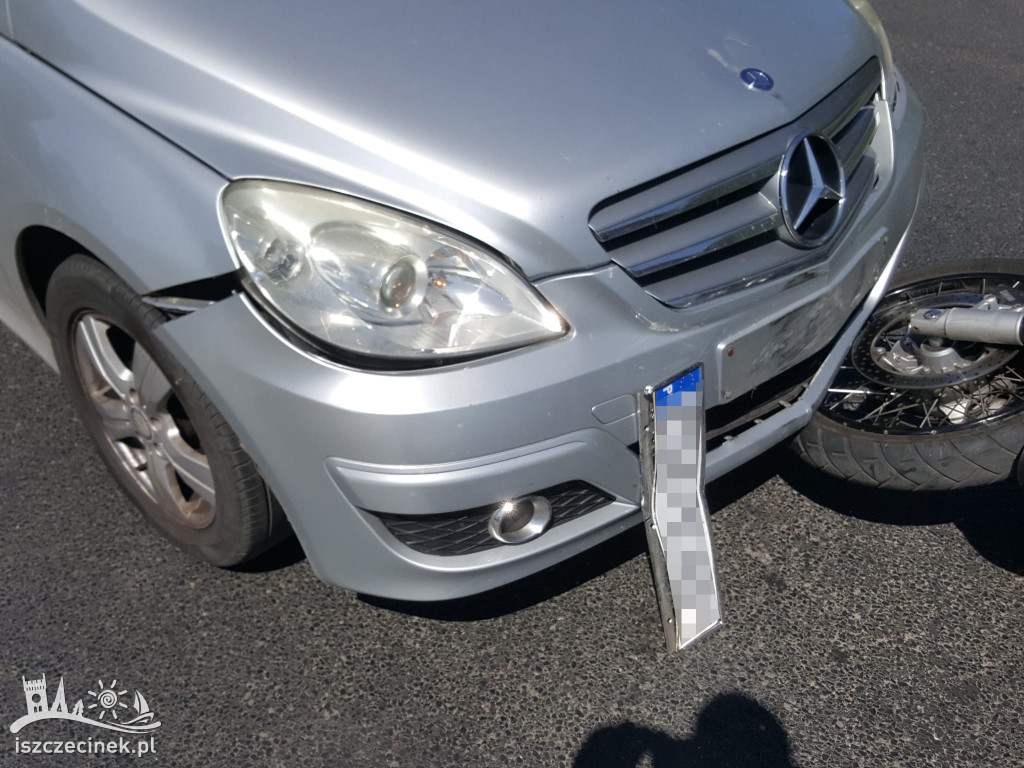 W czwartek, po godzinie 13:00, przy McDonald's w Szczecinku doszło do zderzenia motocykla z samochodem osobowym. Motocyklista, skręcając w lewo z ulicy Cieślaka, wymusił pierwszeństwo na jadącym prosto Mercedesie.